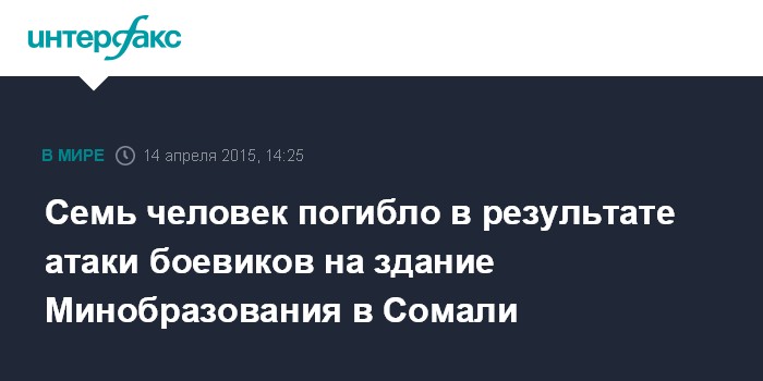 Москва. 14 апреля. INTERFAX.RU - По меньшей мере, семь человек были убиты в результате нападения боевиков на министерство образования в столице Сомали Могадишо, сообщает во вторник "Би-би-си".