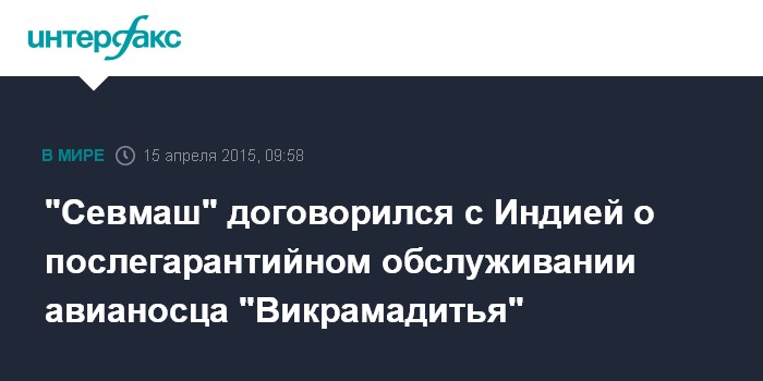 Москва. 15 апреля. INTERFAX.RU - ОАО "ПО "Севмаш" (Северодвинск, Архангельская область) окажет содействие ВМС Индии в послегарантийном обслуживании авианосца "Викрамадитья", сообщила пресс-служба предприятия в среду.