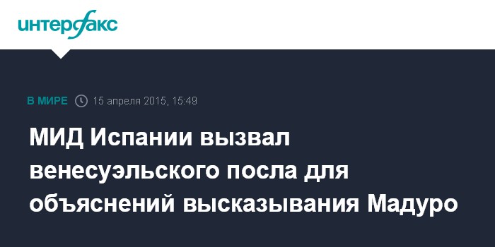 Москва. 15 апреля. INTERFAX.RU - Посол Венесуэлы в Мадриде Марио Риккардо Исеа в среду вызван в испанский МИД для объяснений в связи с высказываниями венесуэльского президента Николаса Мадуро, который ранее назвал главу правительства Испании "расистом".