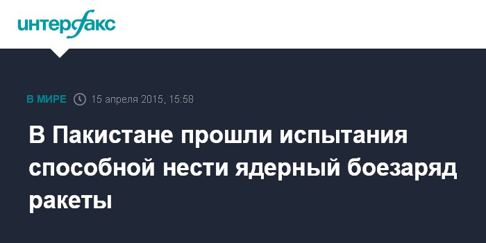 Москва. 15 апреля. INTERFAX.RU - Испытания баллистической ракеты "Гаур", способной нести ядерную боеголовку, проведены в среду в Пакистане.