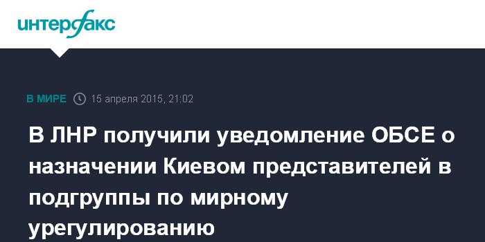 Москва. 15 апреля. INTERFAX.RU - В ЛНР заявляют, что получили уведомление от ОБСЕ о назначении Киевом представителей в подгруппы по отдельным вопросам мирного урегулирования.