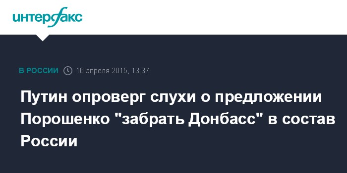 Москва. 16 апреля. INTERFAX.RU - Владимир Путин в ходе "прямой линии" опроверг информацию о том, что его украинский коллега Петр Порошенко в ходе переговоров в Минске предлагал ему "забрать Донбасс".
