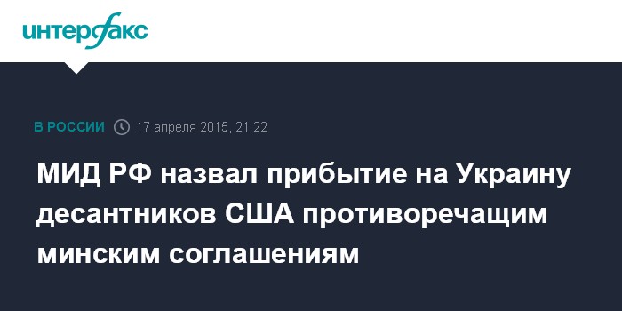 Москва. 17 апреля. INTERFAX.RU - Москва озабочена прибытием на Украину американских десантников, считает, что это противоречит минским договоренностям, и расценивает эти действия как первый шаг к поставкам Киеву современных американских вооружений, заявляют в МИД РФ.