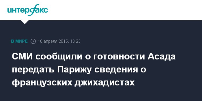 Москва. 18 апреля. INTERFAX.RU - Сирийский президент Башар Асад выразил готовность информировать руководство Франции о гражданах этой страны, примкнувших к экстремистам в Сирии, в обмен на изменение жесткой политики Парижа в отношении Дамаска, пишет в субботу газета Le Parisien.