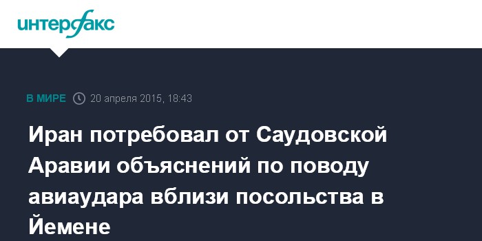 Москва. 20 апреля. INTERFAX.RU - Посол Саудовской Аравии в Тегеране был вызван в понедельник в МИД Ирана в связи с авиаударом ВВС арабской коалиции недалеко от иранского посольства в столице Йемена Сане, передал телеканал "Пресс-ТВ".
