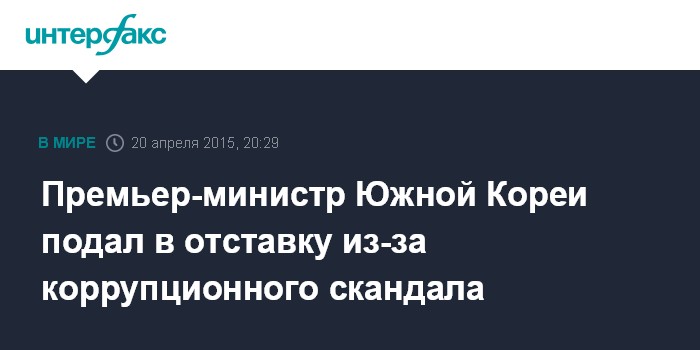 Москва. 20 апреля. INTERFAX.RU - Премьер-министр Южной Кореи Ли Ван Гу подал прошение об отставке президенту страны Пак Кын Хе на фоне коррупционного скандала, передают в понедельник южнокорейские СМИ.