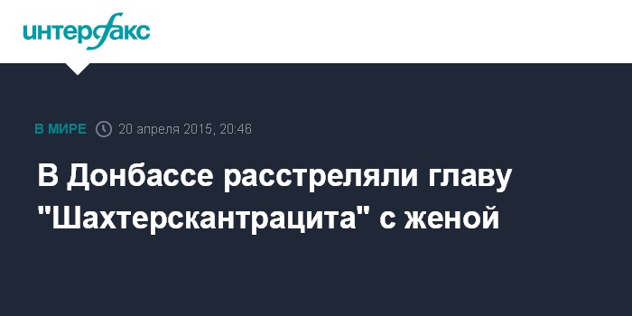 Москва. 20 апреля. INTERFAX.RU - Неизвестные убили руководителя угольного предприятия "Шахтерскантрацит" Николая Ковалева и его супругу, сообщил агентству "Интерфакс" глава Независимого профсоюза горняков Украины Михаил Волынец.