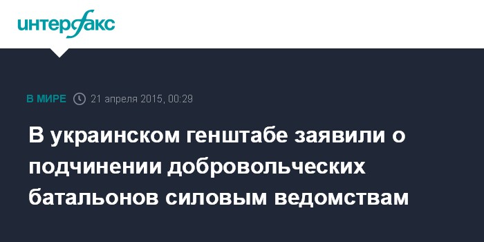 Москва. 21 апреля. INTERFAX.RU - В генеральном штабе вооруженных сил Украины подчеркивают, что все так называемые добровольческие батальоны в зоне операции в Донбассе подчинены украинским силовым ведомствам.