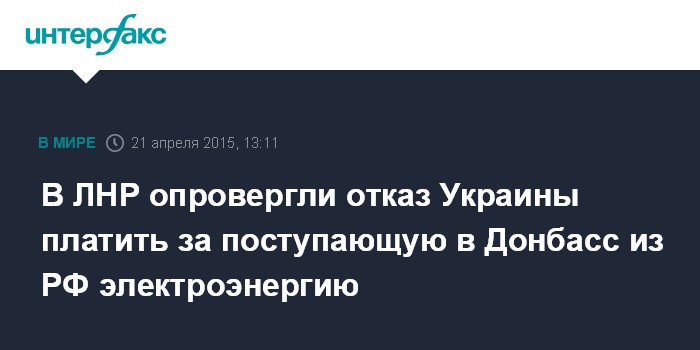 Москва. 21 апреля. INTERFAX.RU - В компании "Луганское энергетическое объединение" (ЛЭО) опровергли сообщение министерства энергетики и угольной промышленности Украины о том, что с 10 апреля Киев не оплачивает электроэнергию, которая поступает в самопровозглашенную Луганскую народную республику из России.