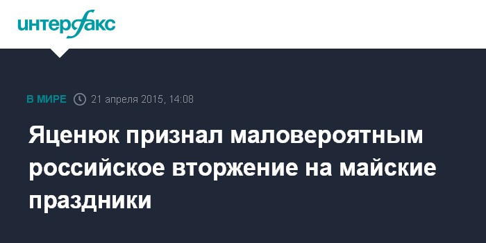Москва. 21 апреля. INTERFAX.RU - Премьер Украины Арсений Яценюк не ожидает военного вторжения России на майские праздники, но призывает готовить оборону и обновлять военную технику.