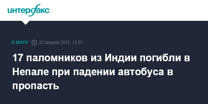 Москва. 22 апреля. INTERFAX.RU - Автобус с 45 индийскими паломниками сорвался в пропасть на горной дороге Непала, в результате погибли 17 человек, сообщает в среду британская телерадиокорпорация "Би-би-си".