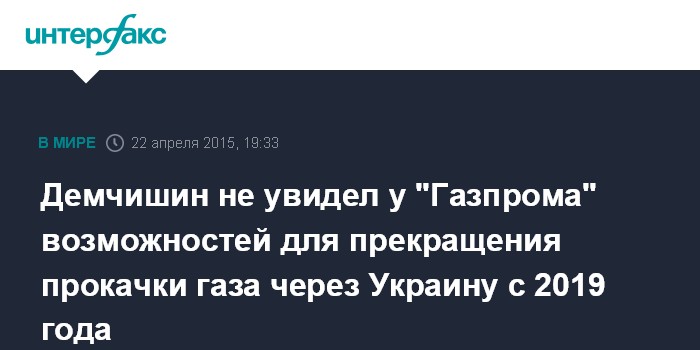 Москва. 22 апреля. INTERFAX.RU -У "Газпрома" нет технической возможности прекратить прокачку газа через Украину с 2019 года, заявил журналистам глава Минэнергоугля Украины Владимир Демчишин журналистам в рамках конференции HIS CERAWeek.