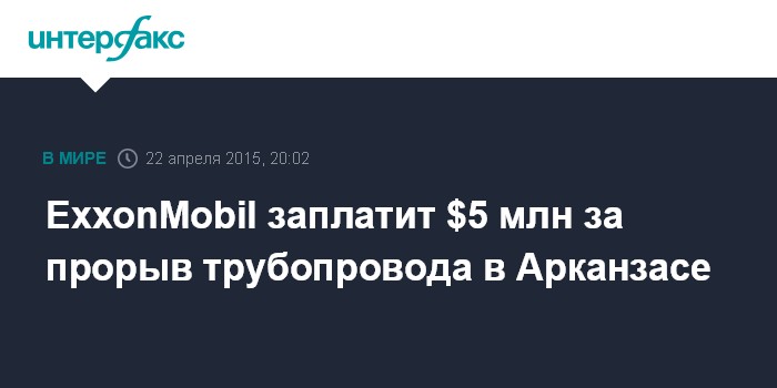 Москва. 22 апреля. INTERFAX.RU - Крупнейшая нефтяная компания мира ExxonMobil заплатит свыше $5 млн штрафа за прорыв трубопровода в штате Арканзас в 2013 году, сообщает агентство Bloomberg.