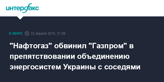 Москва. 22 апреля. INTERFAX.RU - В НАК "Нафтогаз Украины" считают, что ОАО "Газпром" своими действиями мешает процессу объединения энергетических систем Украины и соседних стран, которые входят в Евросоюз.