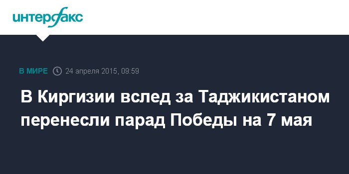 Москва. 24 апреля. INTERFAX.RU - В Киргизии парад по случаю 70-летия Победы в Великой Отечественной войне переносится на 7 мая, сообщили в пятницу "Интерфаксу" в Генштабе Вооруженных сил (ГШ ВС) республики.