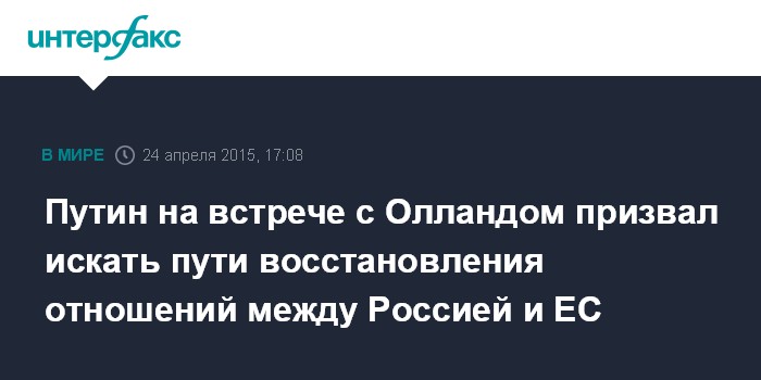 Москва. 24 апреля. INTERFAX.RU - Владимир Путин призвал Евросоюз предпринять шаги для восстановления отношений с Россией. Такое заявление он сделал в ходе встречи с президентом Франции Франсуа Олландом в Ереване.