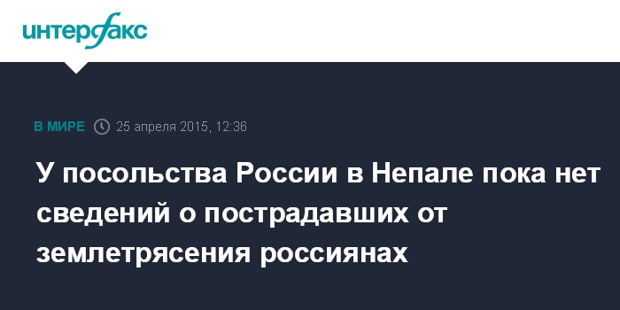 Москва. 25 апреля. INTERFAX.RU - Информации о пострадавших гражданах России во время землетрясения в Непале пока нет, сообщил "Интерфаксу" в субботу представитель посольства РФ в этой стране.