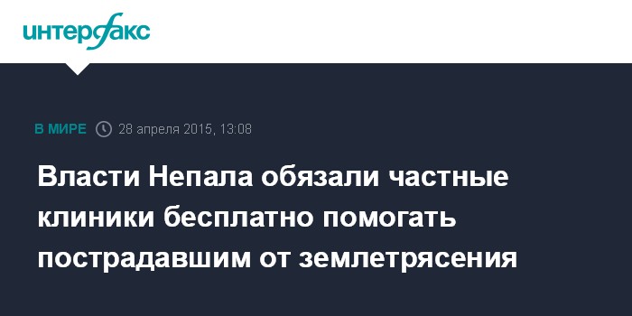 Москва. 28 апреля. INTERFAX.RU - Правительство Непала обязало персонал частных медицинских клиник бесплатно лечить людей, пострадавших от землетрясения, иначе учреждение может лишиться лицензии, сообщает во вторник The Guardian.