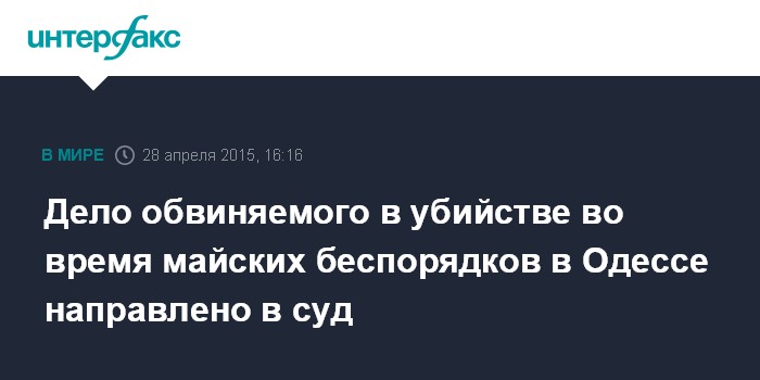 Москва. 28 апреля. INTERFAX.RU - Генпрокуратура Украины 22 апреля направила на рассмотрение Приморского суда Одессы обвинительное заключение по подозрению гражданина в умышленном убийстве во время беспорядков 2 мая 2014 года в Одессе.