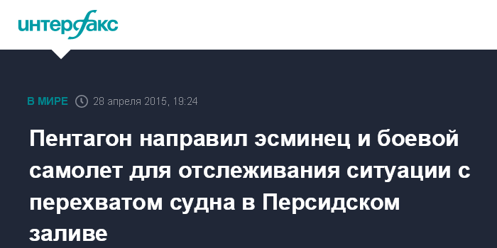 Ранее межарабский телеканал "Аль-Арабийя" сообщил, что корабль иранских ВМС произвел задержание американского грузового судна. В Пентагоне заявили, что судно шло под флагом Маршалловых островов и граждан США на нем нет.