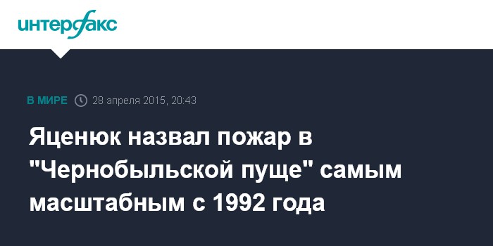 Москва. 28 апреля. INTERFAX.RU - Лесной пожар, начавшийся во вторник в зоне отчуждения на территории специального комбината "Чернобыльская пуща" (Киевская область), стал самым масштабным с 1992 года, однако ситуация находится под контролем, заявил премьер Украины Арсений Яценюк.