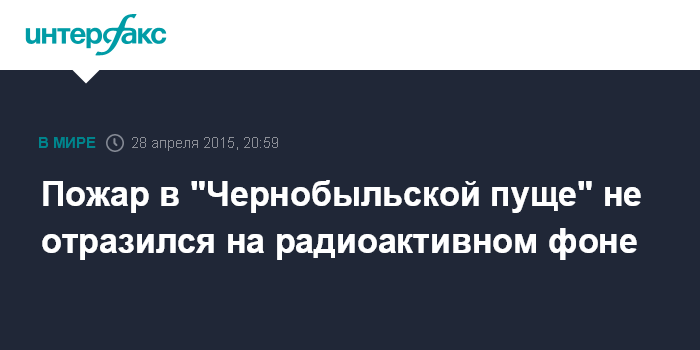 Москва. 28 апреля. INTERFAX.RU - Премьер-министр Украины Арсений Яценюк заявляет, что изменения радиоактивного фона в связи с масштабным возгоранием леса в зоне отчуждения на территории специального комбината "Чернобыльская пуща" (Киевская область) не произошло.