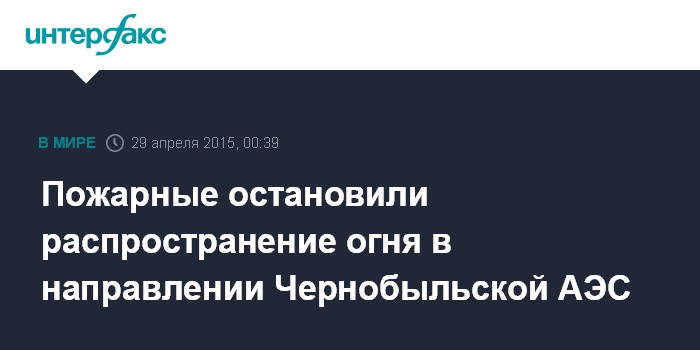 Москва. 29 апреля. INTERFAX.RU - Пожарные остановили распространение огня в направлении Чернобыльской АЭС и продолжают локализацию природного пожара в Чернобыльской зоне, сообщил и.о. главы Государственной службы Украины по чрезвычайным ситуациям Зорян Шкиряк.