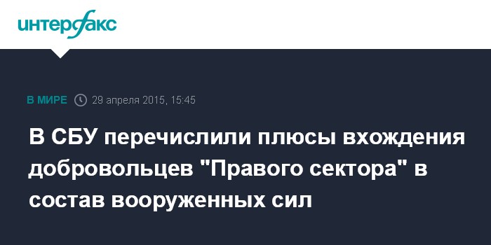 Москва. 29 апреля. INTERFAX.RU - Бойцы Добровольческого украинского корпуса "Правого сектора" (организация "Правый сектор" запрещена в РФ как экстремистская - ИФ) должны войти в Вооруженные силы Украины и таким образом усилить их обороноспособность, заявил глава Службы безопасности Украины Валентин Наливайченко.