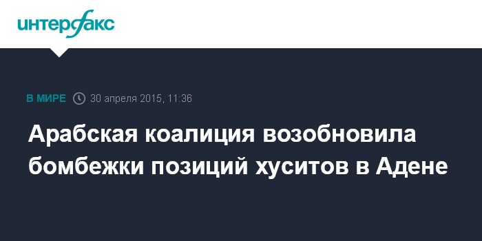 Москва. 30 апреля. INTERFAX.RU - ВВС возглавляемой Саудовской Аравией коалиции нанесли в четверг очередные удары по боевикам-хуситам в южном Йемене, сообщают арабские СМИ.