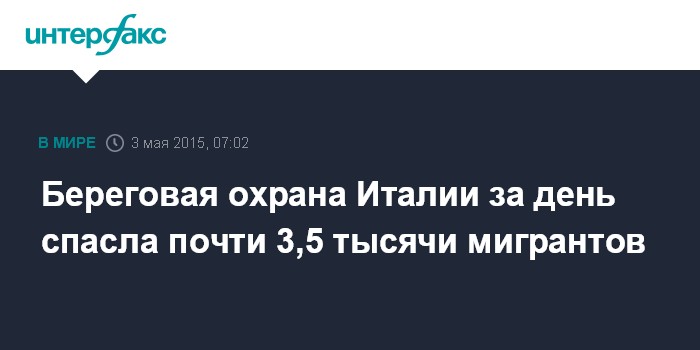 Москва. 3 мая. INTERFAX.RU - Корабли береговой охраны Италии в субботу спасли 3427 мигрантов из стран Африки и Ближнего Востока, которые на трех судах пытались достичь итальянского побережья, сообщил представитель береговой охраны.