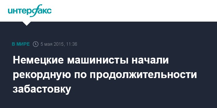 Москва. 5 мая. INTERFAX.RU - Профсоюз немецких машинистов железнодорожного транспорта GDL в начал очередную, на этот раз более продолжительную, забастовку, которая, как ожидается, продлится до 9:00 по местному времени (10:00 мск) 10 мая.