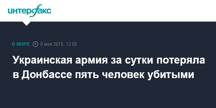 Москва. 6 мая. INTERFAX.RU - За минувшие сутки в зоне проведения военной операции в Донбассе погибли пять украинских военных, еще 12 получили ранения, сообщил представитель администрации президента Украины Андрей Лысенко.