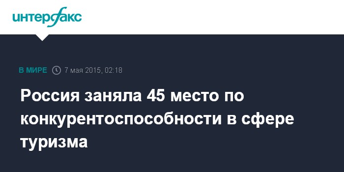 Москва. 7 мая. INTERFAX.RU - Россия по итогам 2014 года заняла 45-е место в рейтинге туристической конкурентоспособности стран, сообщает BBC, ссылаясь на доклад Всемирного экономического форума. Лидером рейтинга стала Испания, на втором месте - Франция, третью строчку занимает Германия. На четвертом и пятом местах - США и Великобритания соответственно.