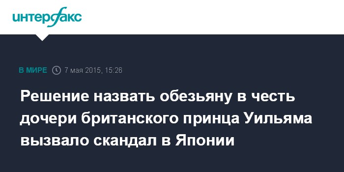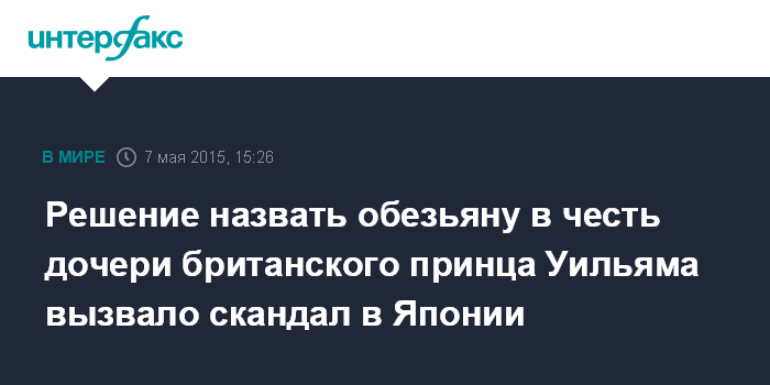 Москва. 7 мая. INTERFAX.RU - Негативную реакцию в японском обществе вызвала кличка обезьяны, появившейся на свет в зоопарке префектуры Оита на юге Японии, которую назвали Шарлоттой - в честь недавно родившейся дочери герцога и герцогини Кембриджских.