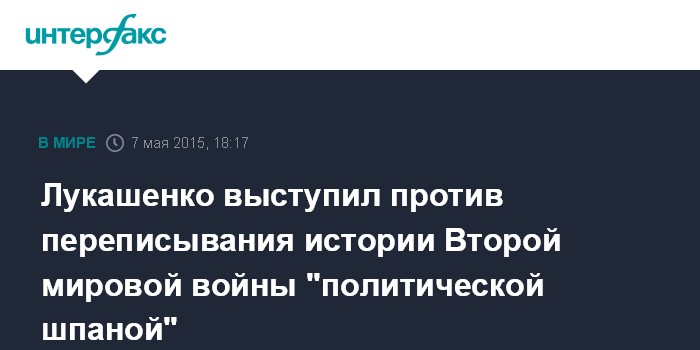 Москва. 7 мая. INTERFAX.RU - Президент Белоруссии Александр Лукашенко выступил против попыток фальсификации истории Второй мировой войны в бывших республиках СССР.