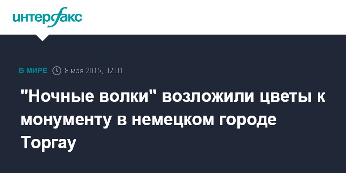 Москва. 8 мая. INTERFAX.RU - Колонна "Ночных Волков" возложила цветы к монументу в Торгау (Германия), говорится в сообщении, размещенном в пятницу в блоге мотоклуба.