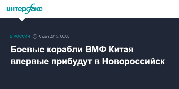 Москва. 8 мая. INTERFAX.RU - Боевые корабли КНР прибудут в Новороссийск для участия в торжественных мероприятиях, посвященных 70-летию Победы. Об этом сообщил представитель управления пресс-службы и информации Министерства обороны РФ по ВМФ капитан первого ранга Игорь Дыгало.