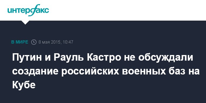 Москва. 8 мая. INTERFAX.RU - Президент России Владимир Путин и глава правительства Кубы Рауль Кастро не обсуждали вопрос об открытии российских военных баз на Кубе в ходе своей встречи в Москве, сообщил журналистам пресс-секретарь главы российского государства Дмитрий Песков.