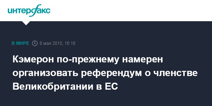 Москва. 8 мая. INTERFAX.RU - Премьер-министр Великобритании Дэвид Кэмерон, чья партия победила на парламентских выборах, заверил в пятницу, что его планы провести референдум о членстве Великобритании в ЕС, остаются в силе, сообщает The Guardian.