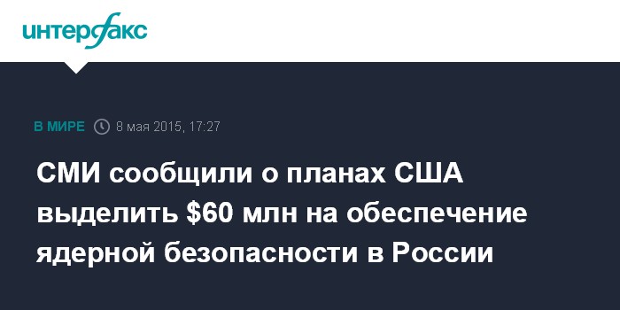 Москва. 8 мая. INTERFAX.RU - Министерство энергетики США намеревается выделить в течение текущего года более $60 млн для финансирования в России мероприятий, направленных на повышение безопасности в ядерной сфере, утверждает американское издание Washington Free Beacon.