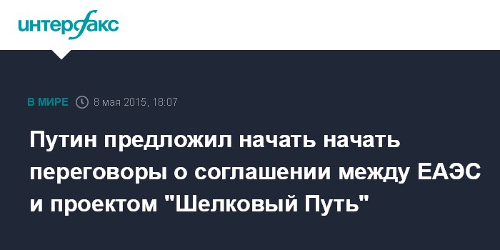 "Перспективным представляется развитие торгово-экономического сотрудничества Евразийского союза с КНР. Говорил об этом сегодня с председателем КНР Си Цзиньпином. Председатель КНР также проявляет к этому интерес и говорит о том, что этот процесс вполне можно было бы вписать в экономический пояс так называемого "Шелкового пути" - проекта, который продвигается нашими друзьями в Китае", - сказал Путин на заседании Высшего Евразийского экономического совета в Москве.