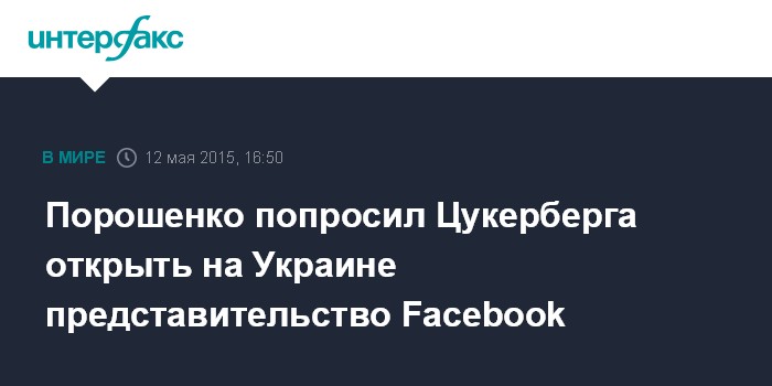 Москва. 12 мая. INTERFAX.RU - Президент Украины Петр Порошенко предлагает создателю социальной сети Facebook Марку Цукербергу открыть представительство компании на Украине.