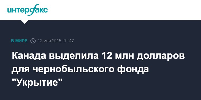 Москва. 13 мая. INTERFAX.RU - Власти Канады приняли решение внести 12 млн долларов в Международный чернобыльский фонд "Укрытие" (ЧФУ), сообщил министр иностранных дел Канады Роб Николсон.