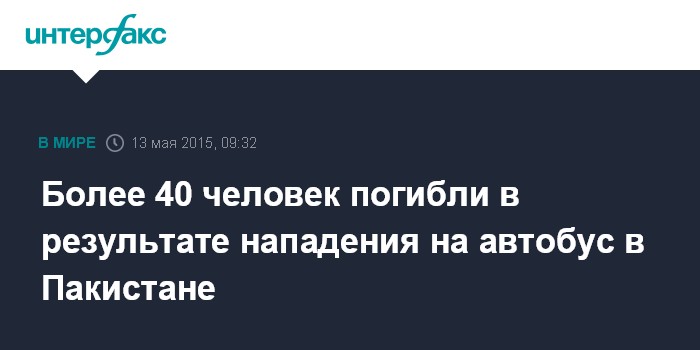 Москва. 13 мая. INTERFAX.RU - Обстрел автобуса в пакистанском Карачи привел к гибели не менее 41 человека, еще 20 получили ранения, сообщается в среду на сайте местной газеты "Дон".