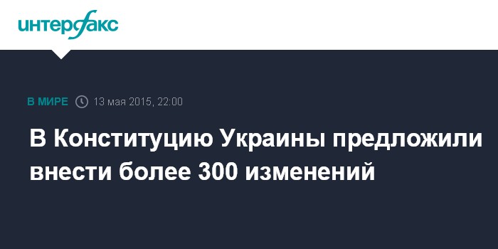 Москва. 13 мая. INTERFAX.RU - Члены рабочей группы по вопросам организации государственной власти и децентрализации, созданной в составе Конституционной комиссии, внесли 312 предложений по изменениям в Основной закон Украины, сообщил руководитель Главного юридического управления аппарата Верховной рады, член Конституционной комиссии Михаил Теплюк.