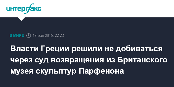Москва. 13 мая. INTERFAX.RU - Власти Греции приняли решение отказаться от подачи иска в международные суды с целью добиться реституции античных памятников культуры из Парфенона, которые в настоящий момент находятся в Великобритании, сообщает в среду британское издание The Guardian.