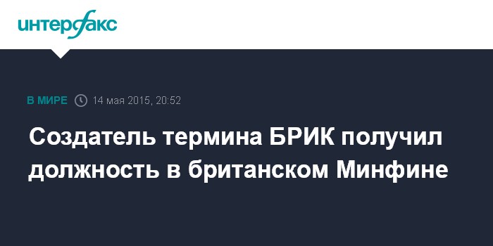 Москва. 14 мая. INTERFAX.RU - Создатель термина БРИК (Бразилия, Россия, Индия, Китай), бывший старший экономист Goldman Sachs Джим О'Нил в четверг назначен торговым атташе при министерстве финансов Великобритании, а также получил пожизненный титул пэра, сообщает Financial Times.