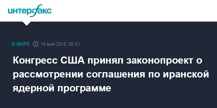 Москва. 15 мая. INTERFAX.RU - Члены палаты представителей конгресса США одобрили законопроект, позволяющий законодателям рассмотреть и, в случае несогласия, отменить соглашение по иранской ядерной программе (ИЯП), сообщили СМИ.