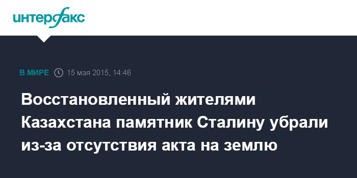 Москва. 15 мая. INTERFAX.RU - Памятник Иосифу Сталину, установленный в саду жителя поселка Старый Икан Южно-Казахстанской области, в пятницу был демонтирован по настоянию местных властей.