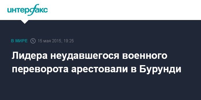 Москва. 15 мая. INTERFAX.RU - Бурундийские военнослужащие арестовали в пятницу генерала Годфруа Ньиомбаре, попытавшегося свергнуть президента страны Пьера Нкурунзизу, сообщают западные СМИ.